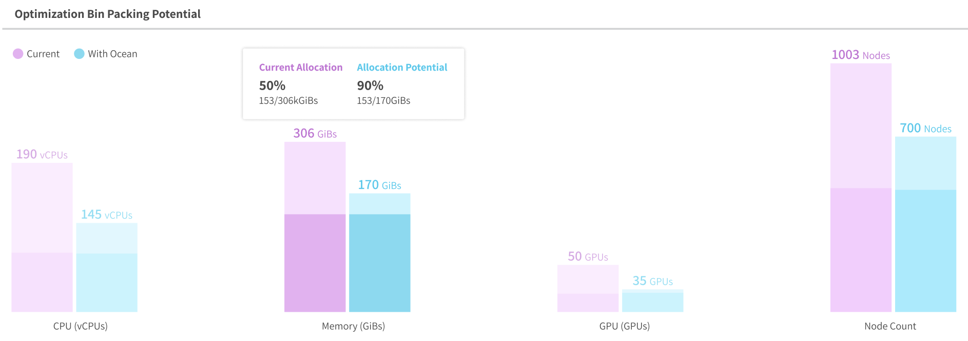 This graph demonstrates the potential for optimizing your resource utilization by applying Ocean bin packing. For each resource, the graph shows a bar for the current allocation and a bar for the estimated allocation after bin packing has been applied. Each bar also shows the percent allocation of resources by workloads, based on their requested resources displayed above.