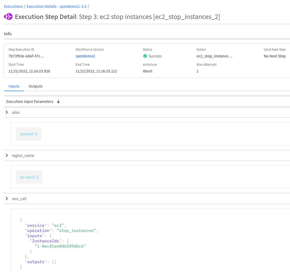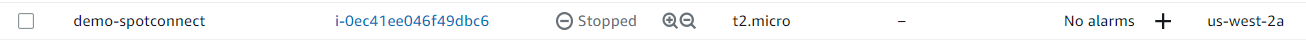 After the execution of the workflow, you can view the status of your EC2 instance in the AWS console to see that it has shut down. You can see that the EC2 instance with the name “demo-spotconnect” state changed to Stopped.
