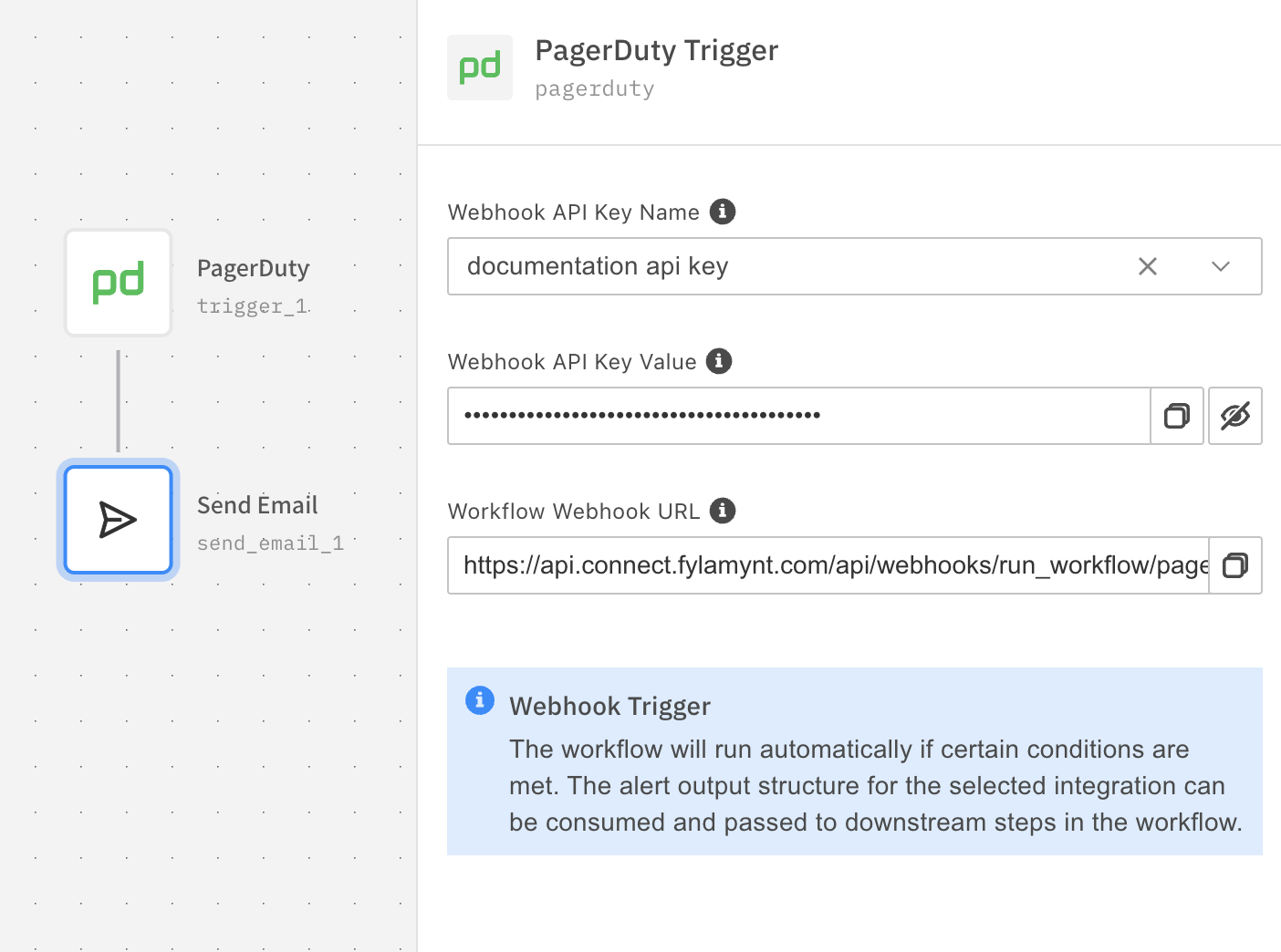 - In the center panel of the workflow builder, click the PagerDuty trigger node to open the right panel. Under Webhook API Key Name, select the API Key you created earlier.