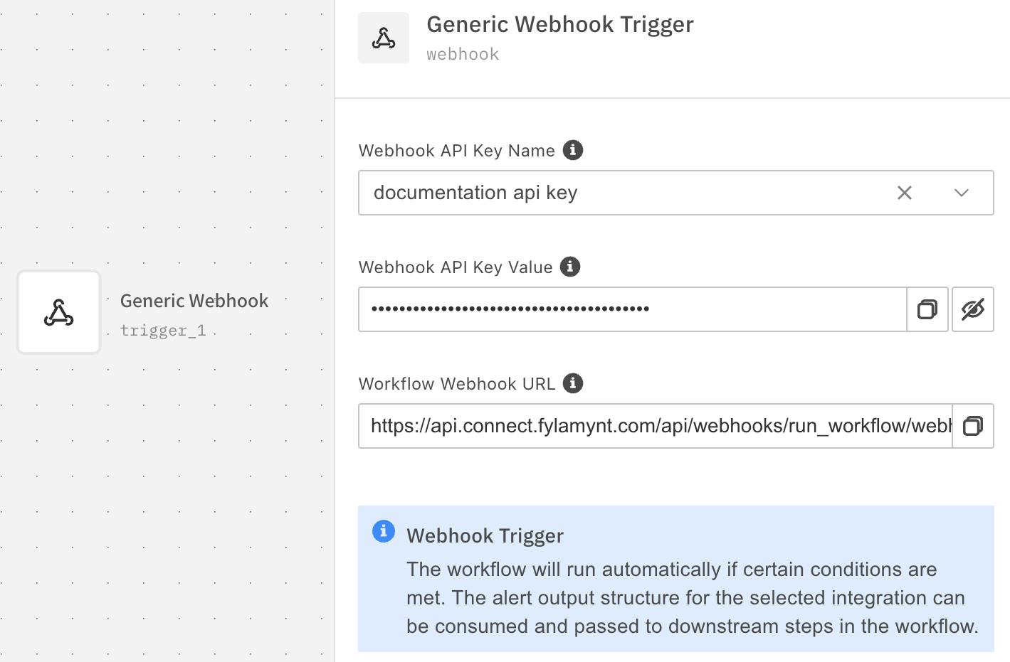 In the center panel of the workflow builder, click the Generic Webhook trigger node to open the right panel. Under Webhook API Key Name, select the API Key you created earlier.