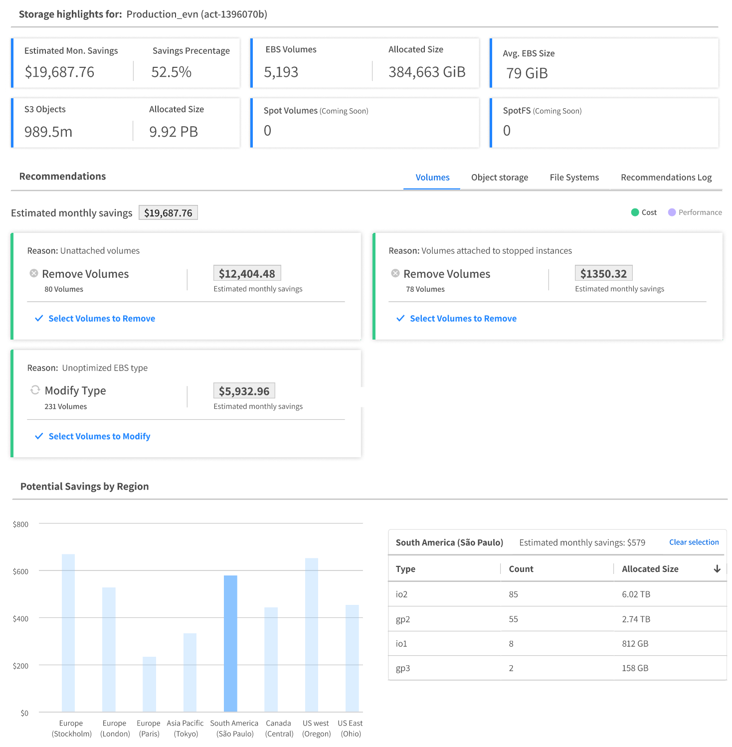 You can use the Spot Storage dashboard directly in the Spot console to view cost optimization recommendations for your managed storage resources. The dashboard covers all storage components across your AWS account and generates real-time actions you can take to address wasted or misconfigured resources. Implementing those suggestions provides high potential cost savings that you can act on immediately.